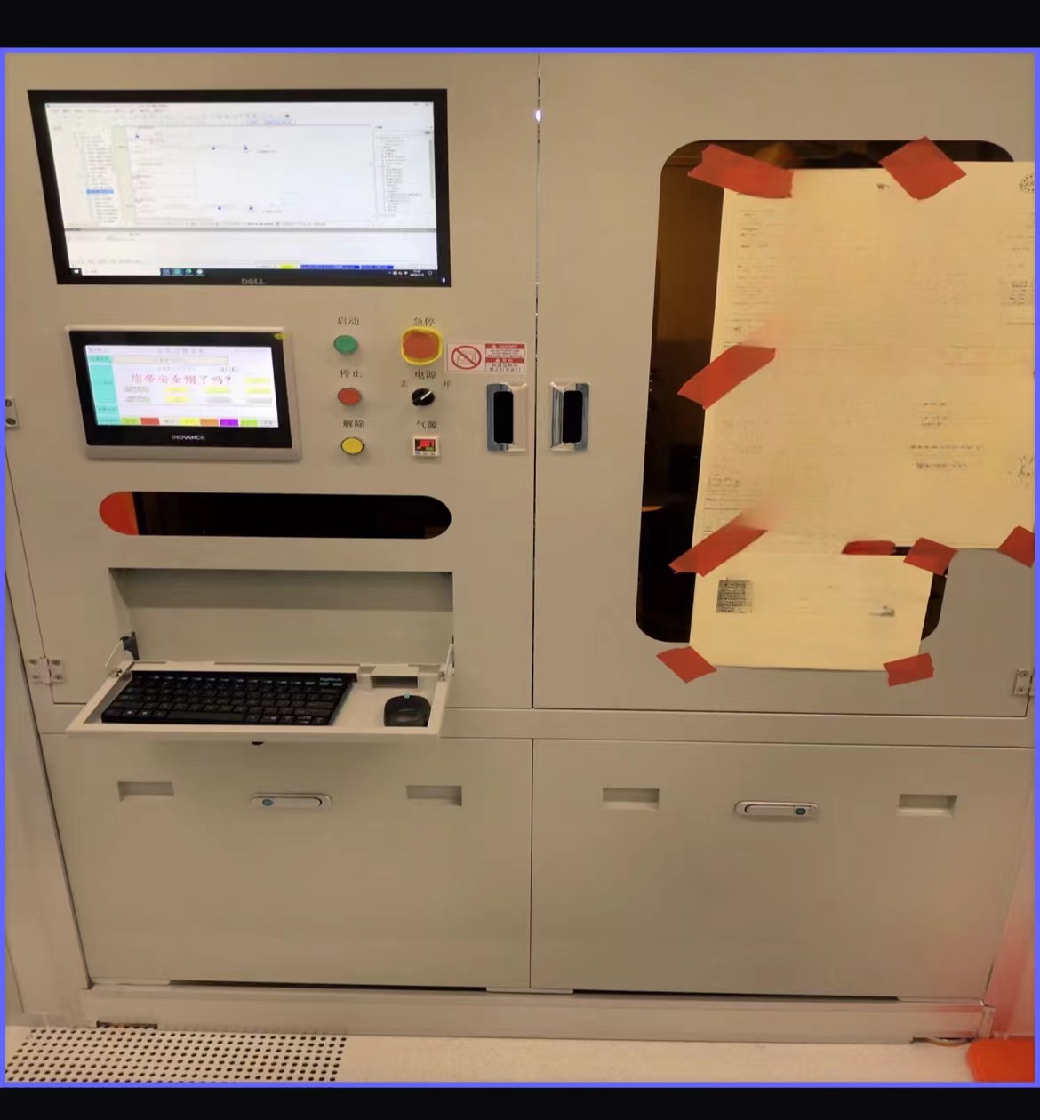 该设备主要由伺服电机系统、加热系统、触摸屏、力矩电机、真空系统、气缸、机架、外罩等部件组成。